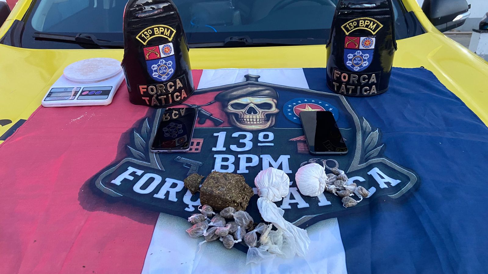 Além das drogas, dois celulares, uma faca e uma balança de precisão foram apreendidos após buscas na região.