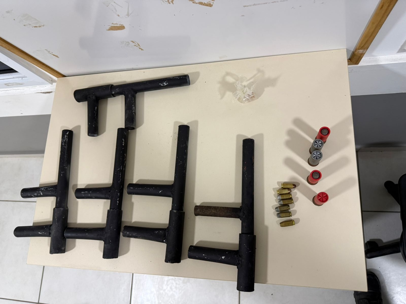 Nas buscas realizadas em seguida, os militares encontraram um balde contendo as armas, munições de calibres 12 e .40, além de uma substância semelhante ao crack.