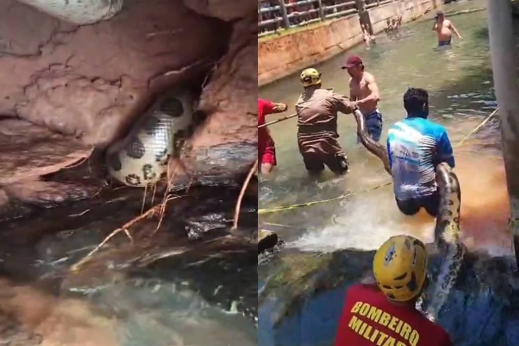 Uma cobra sucuri de cerca de cinco metros de comprimento foi capturada neste domingo (12) por bombeiros em uma área próxima a um balneário em Rio Quente, no interior de Goiás.