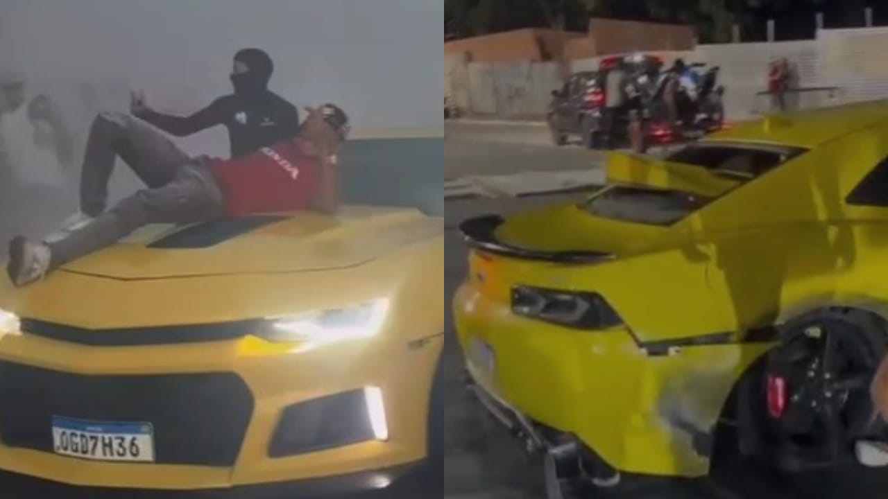 Já em outro momento, o Camaro aparece parado, com o capô levantado, indicando que já poderia estar quebrado. Com isso, um homem colocou uma motocicleta ligada na frente da lateral do carro e ficou forçando a estrutura do carro. Muitas pessoas estavam em volta e é possível ver muita fumaça saindo da moto. Assista: