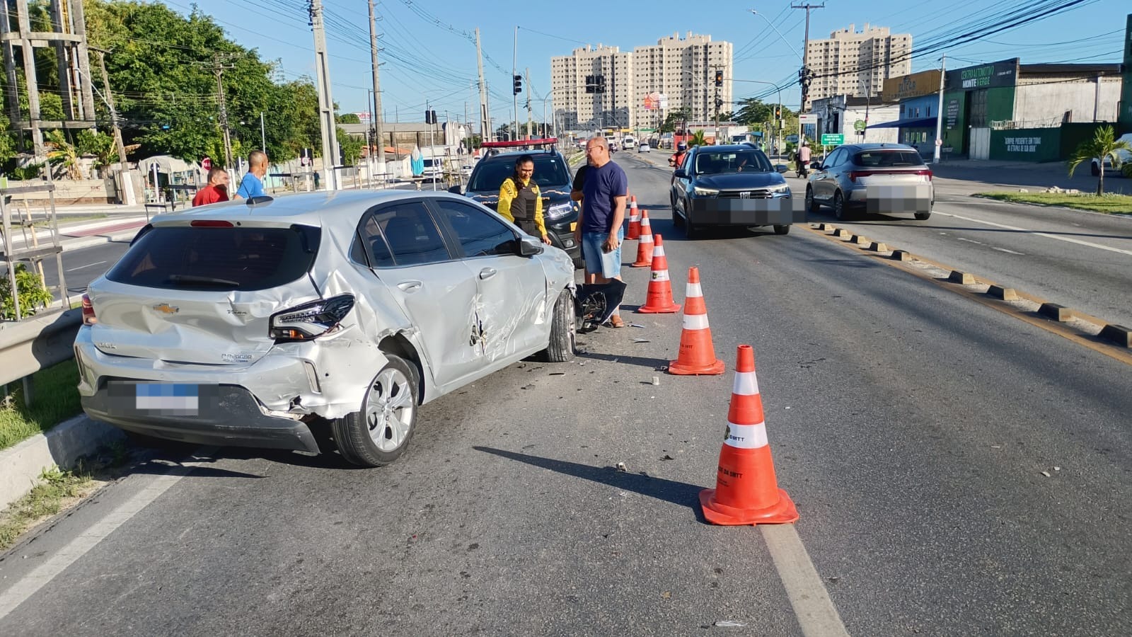 O acidente ocorreu quando o Onix tentava acessar a avenida, causando danos significativos à parte frontal e lateral do veículo.