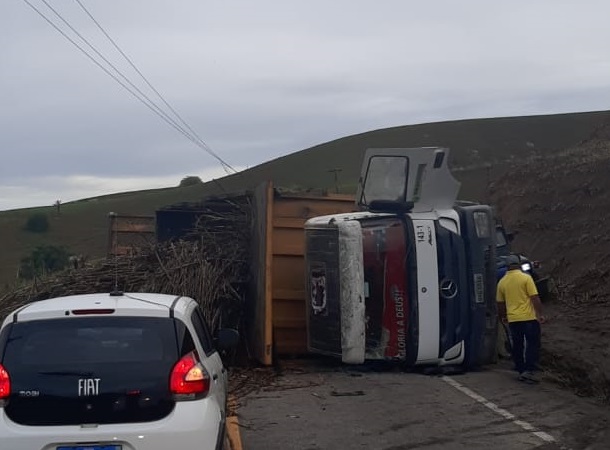 O veículo tombado ocupou uma faixa da via, enquanto a carga de cana se espalhou pelo outro sentido da pista, o que impediu a passagem de outras carretas, ônibus, carros e motos.