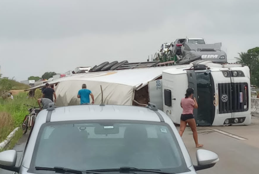 Uma carreta tombou na manhã desta segunda-feira (15) em um trecho da BR-101, no município de Junqueiro, Agreste de Alagoas. Apesar do susto, ninguém ficou ferido.