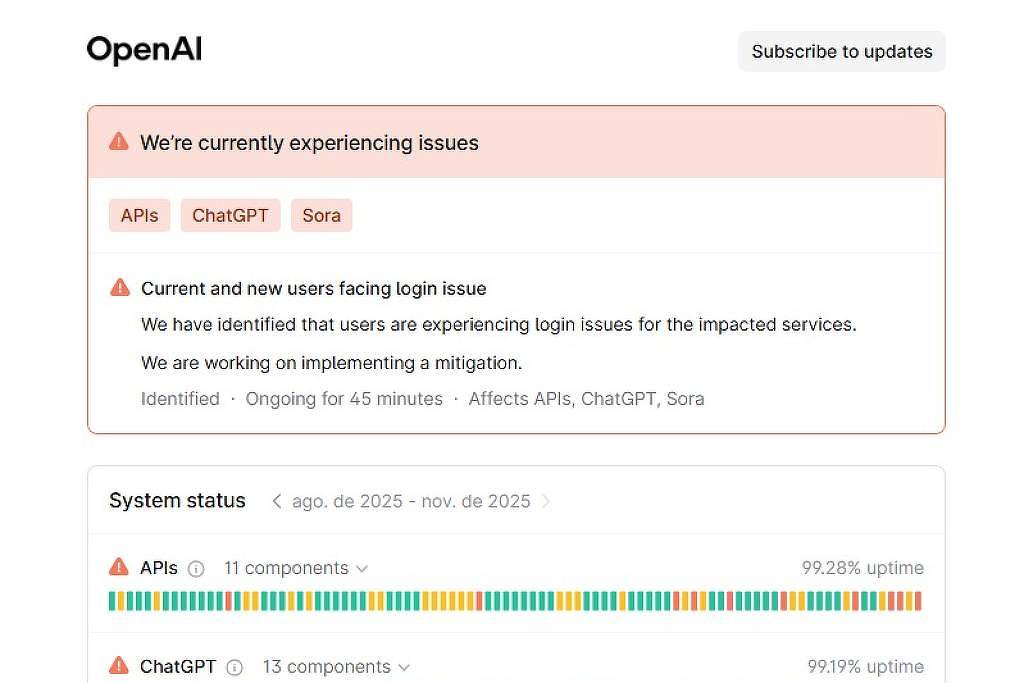 A OpenAI, empresa de inteligência artificial que controla os aplicativos ChatGPT e Sora, informou, em seu site oficial, passa por instabilidade em seus APIs (Interface de Programação de Aplicativos). A companhia diz que trabalha para encontrar uma solução.