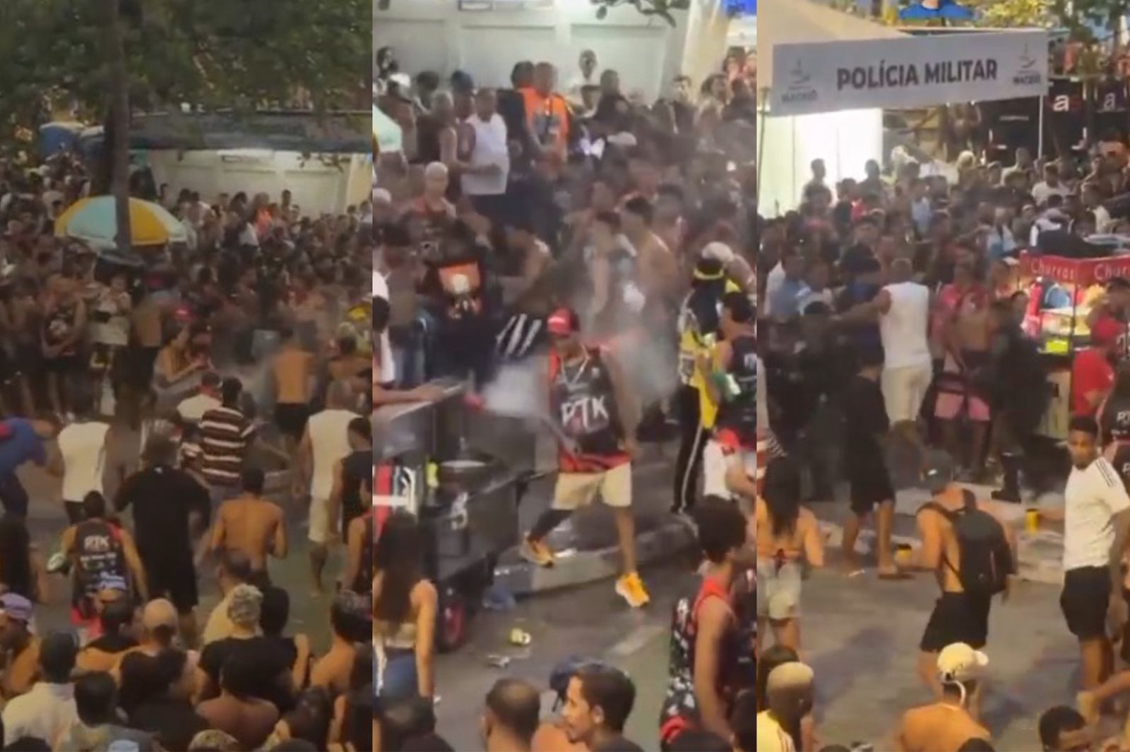 Vídeos que circulam nas redes sociais mostram cenas de correria e agressões, com troca de socos e chutes. Os envolvidos na briga, em sua maioria jovens, não se intimidaram nem mesmo com a presença de um posto policial instalado próximo ao local.