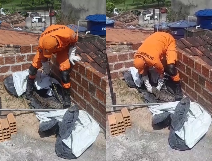 Em vídeo enviado ao TNH1, o jacaré aparece por cima de uma lona, ao lado de tijolos. Um bombeiro é filmado em atuação, já tendo o trabalho de contê-lo. Assista: