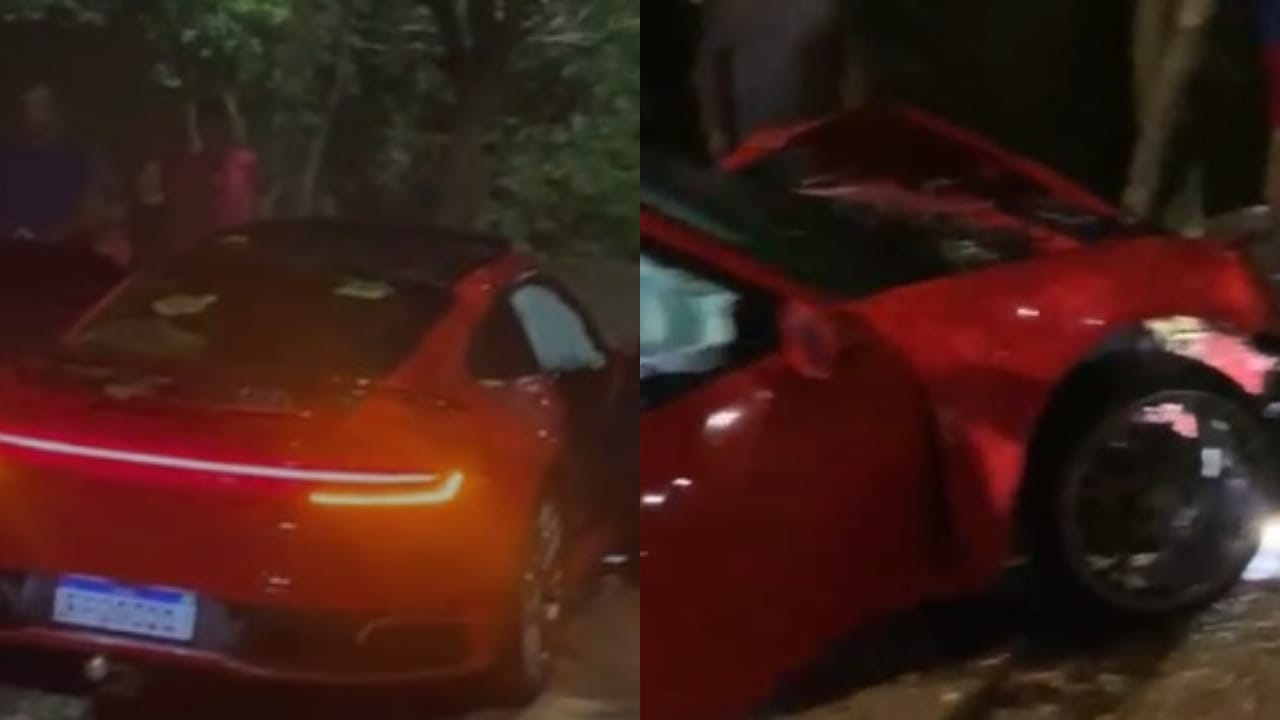 As imagens enviadas ao TNH1 mostram o veículo de cor vermelha destruído após a batida contra a árvore. A parte dianteira foi danificada e o sistema de airbag foi acionado. Dezenas de curiosos se aglomeraram em volta do Porsche abandonado. Veja o vídeo: