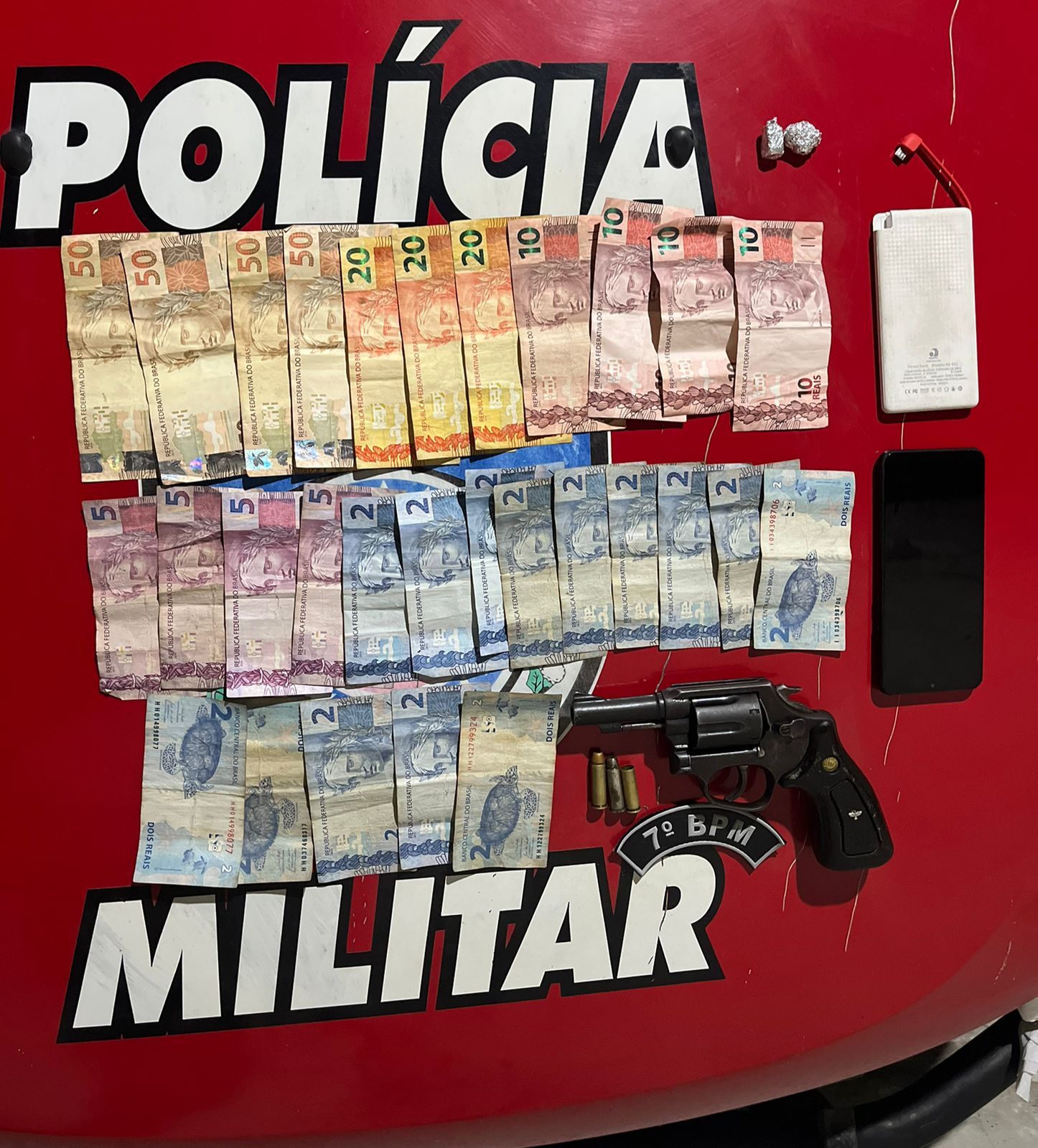 Ao ser questionado sobre o documento da motocicleta, o suspeito de tráfico disse que estava na residência localizada na Rua Nossa Senhora Aparecida, onde morava. Após buscas dentro do imóvel, a PM flagrou uma arma de fogo embaixo da cama. Ela é do tipo revólver Taurus de calibre 38. Uma munição intacta, uma munição pinada, bem como uma cápsula deflagrada, também foram recolhidas.
