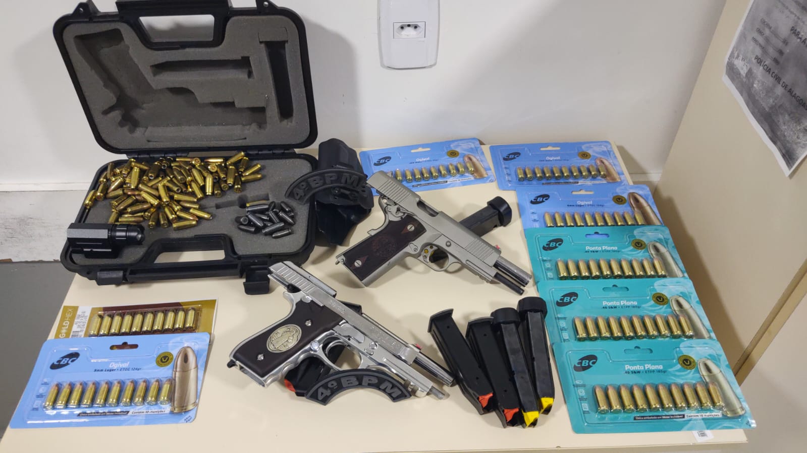 Durante as buscas no interior da clínica, foram apreendidas uma pistola ponto 40, uma pistola nove milímetros, seis carregadores, dois coldres de pistola, as munições, além de um aparelho celular, joias e um relógio.