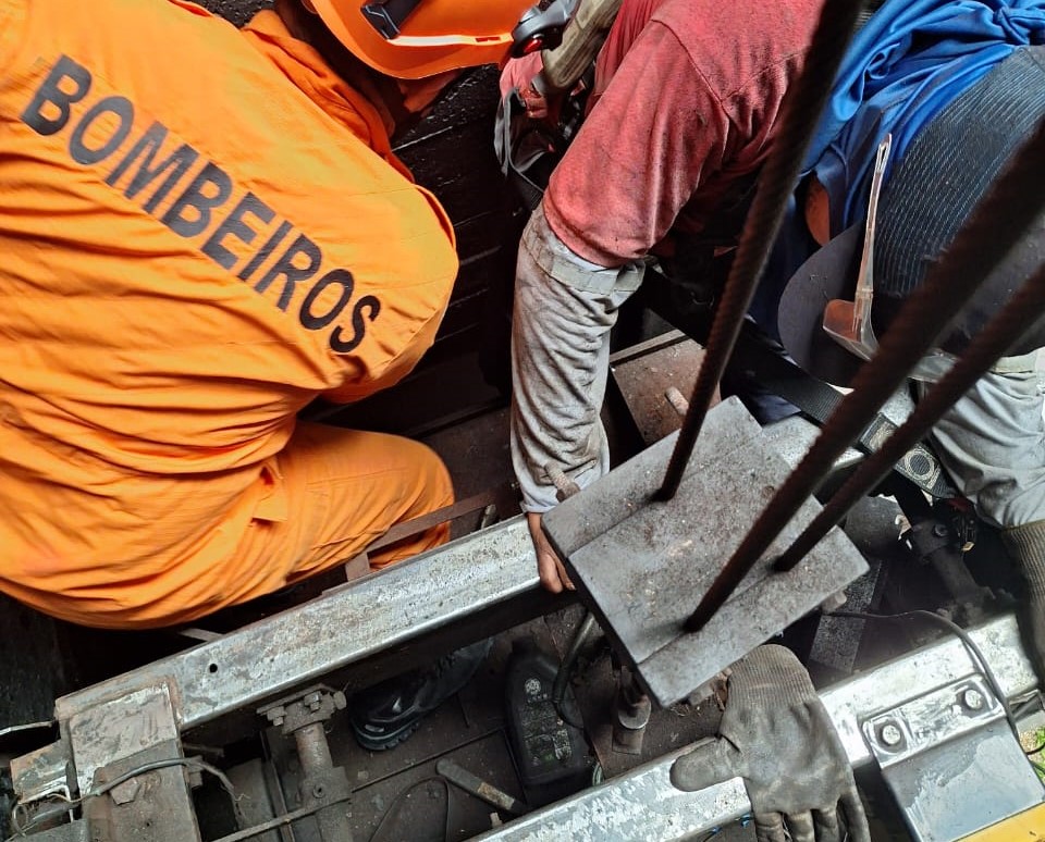 Os bombeiros utilizaram um macaco hidráulico para o resgate, e o trabalhador foi atendido pelo Samu e encaminhado a um hospital para cuidados adicionais.