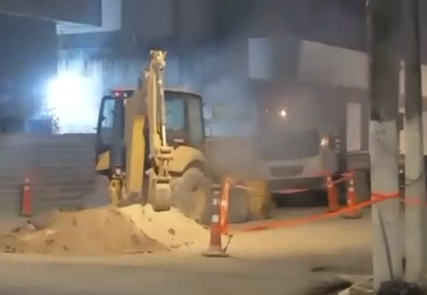 Um vídeo enviado ao TNH1 mostra trabalhadores da empresa de gás e da obra atuando com uma retroescavadeira para conter o vazamento; assista ao vídeo: