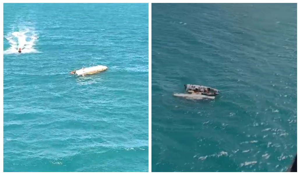 Imagens do resgate mostram um socorrista saltando da aeronave para alcançar a embarcação à deriva, evidenciando a mobilização rápida das equipes de emergência na operação.